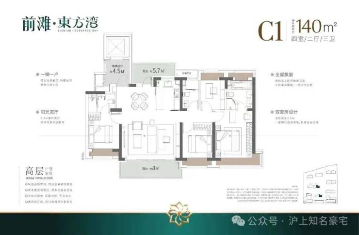 前滩东方湾主推建面约 103-175㎡精装三至四房,覆盖刚需首改、三口之家改善、二胎家庭终极改善等全周期居住需求,户型设计方正通透、全明格局,得房率超 74%,部分户型高达 80%,空间利用率远超同板块竞品,真正实现 “每一寸空间都物尽其用”。