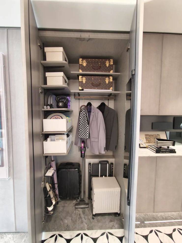 入户时候身上的大衣、孩子的童车、大型的行李箱,都可以置放于此,还贴心设置了换衣镜,加上玄关柜,预计的储物空间约2212L, 相当于50个20寸登机箱的容量。