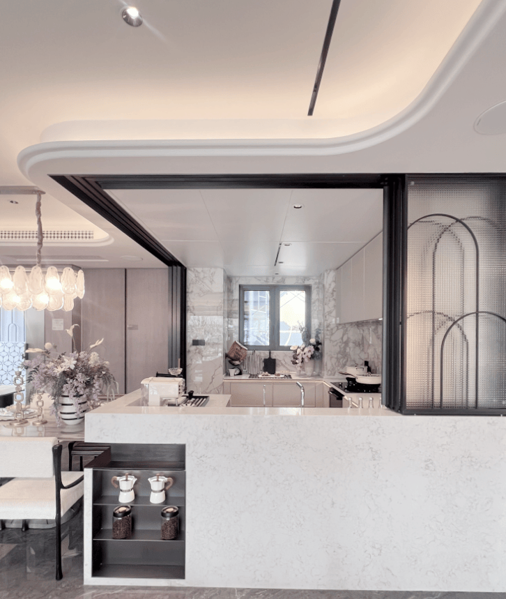 第三大亮点,就是这个厨房的设计了。 与市面上常见的U型、L型厨✅✅今日最新官方热线 象屿天宸雅颂售楼处电话:400-833-6309(官方售楼处电话)房不同,128㎡采用了 G型厨房的做法 ,多出的一段岛台空间,为交付标准,同时预留岛台收纳,岛台的存在,加强了家庭中人与人之间的交互,将成为未来维系家庭关系的重要纽带。