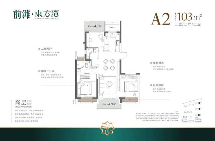 建面103㎡3房2厅2卫, 户型三开间朝南、室内 “5个飘窗+2阳台” ,不管是采光、视野、通风、私密性,还是实用性都十分出色。