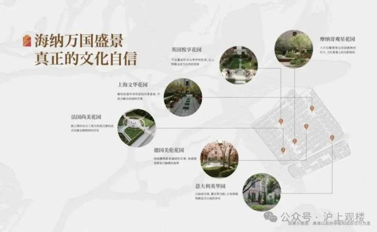 景观呈现上,三棵被园林大师从泰山万里挑一的松树屹立弄巷,诠释着静安里对于社区景观的见解。在未来的社区中,有具备异域风情的摩纳哥观星花园、古典美感的英国悦享花园、浓缩宫殿气质的法国尚美花园、海派意蕴的上海文华花园、以及严谨的德国美伦花园、浪漫的意大利花园。六大万国花园,无不向未来业主展现着“海纳百川”的深度文化自信。