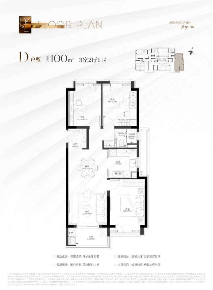建筑面积约100㎡3房D户型:南北通透的设计让该户型拥有更加优秀的通风效果。而且这个户型做到了全卧飘窗(3个飘窗)+南向瞰景大阳台,丰富的灵动空间提升了实得面积!