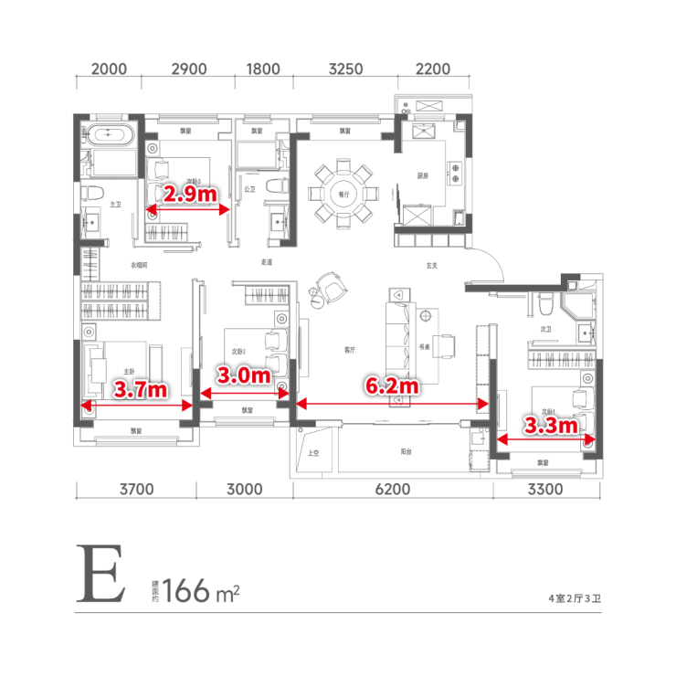 次房间宽也达3.3米;两个小房间开间也有3米和2.9米,都能放大床。