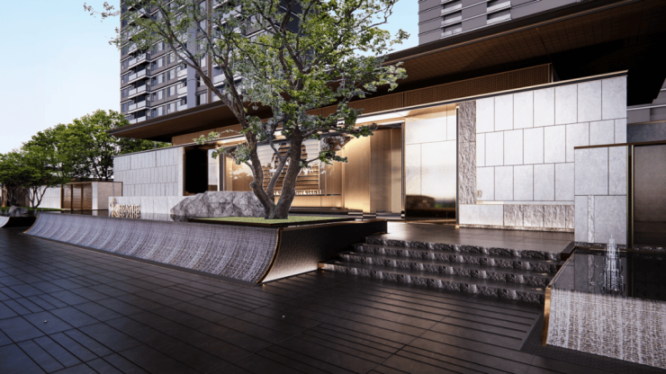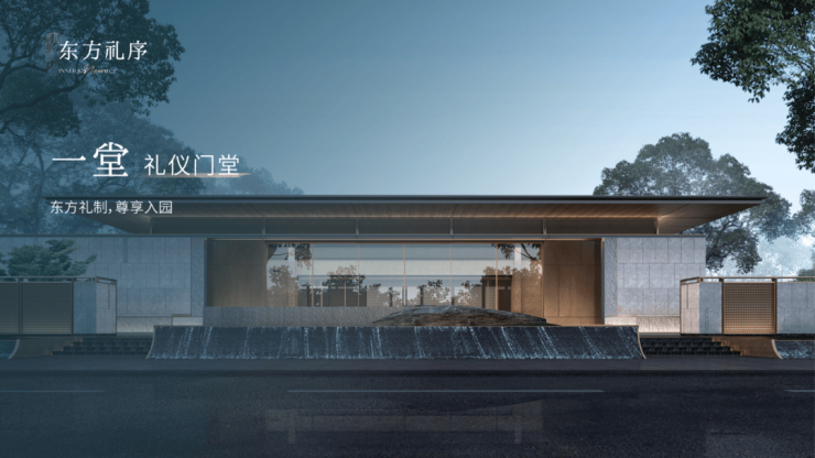 一园三堂的归家动线,象征着东方人文礼序。建筑风格造型,灵感源自金镶玉设计,提取其“曲”的形和白金配色应用到塔楼立面上,彰显项目的温和雅丽与尊贵典雅。