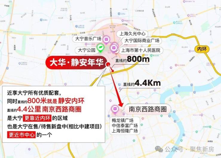 上海改善看静安,静安价值看内环。大华静安年华雄踞静安区延长中路 860 弄(沪太路口),直线距内环高架仅约 800 米,地处大宁板块核心,北接大宁国际成熟生活圈,南邻南京西路 - 静安寺顶级商圈,东临苏州河文化休闲带,西连普陀长寿路高端住区,完美占据四大高端板块几何中心,坐享静安 “中央活动区” 与 “一轴三带” 战略双重红利。