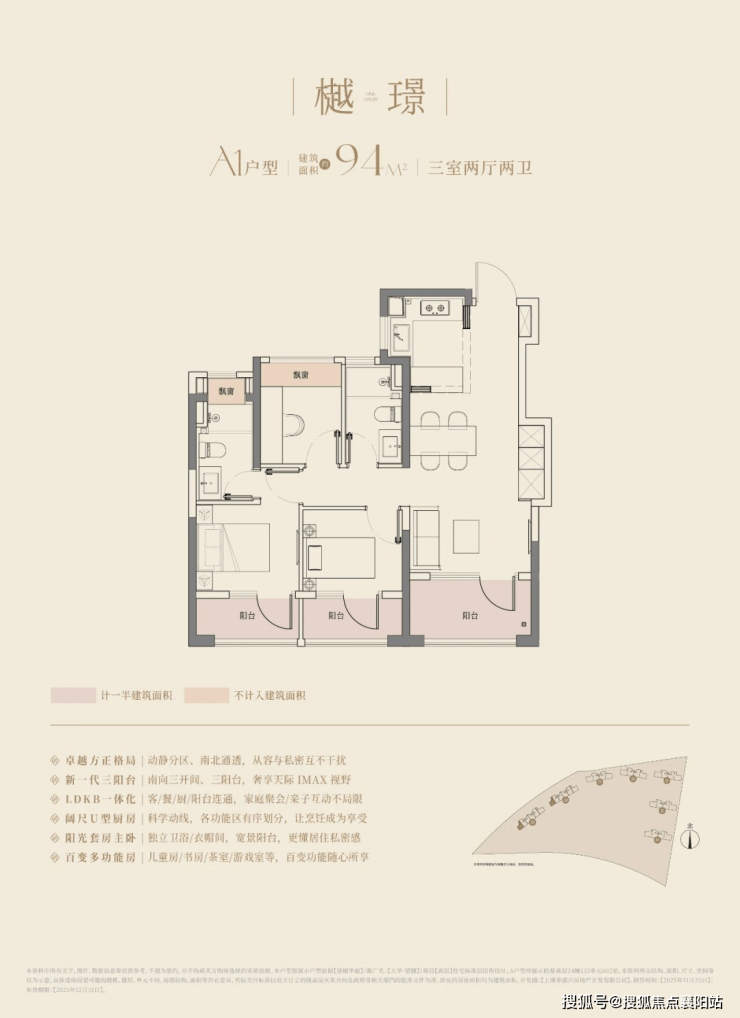 核心亮点 : 三开间朝南 ,南向总面宽约 9.8 米,采光无敌; 创新三阳台设计 (客厅 + 双次卧),拓展空间、观景、晾晒三不误; S 墙入户设计 ,内嵌冰箱 + 超大鞋柜,释放公共空间; 主卧套房 (独立卫浴 + 全景飘窗),私密性强; 双卫全明 ,干湿分离,避免早高峰拥堵。