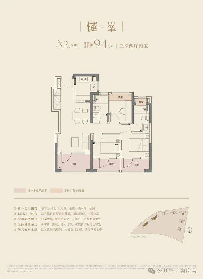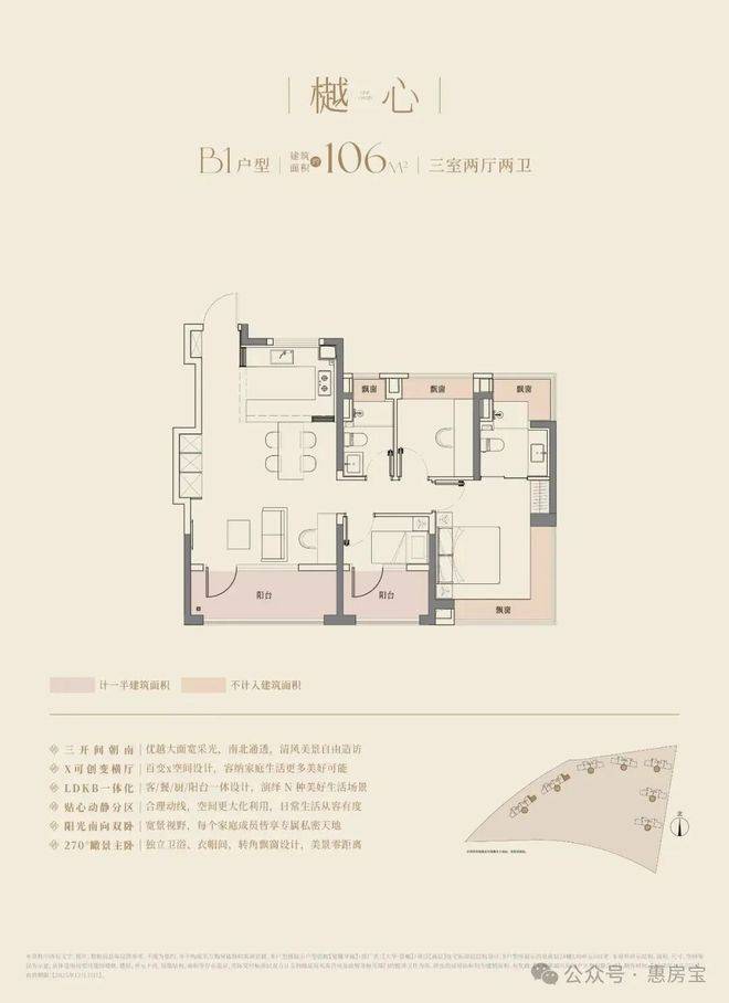 经典动静分离户型,3.5开间朝南+双阳台,阳合仅计算一半建筑面积,主卧以及主卫附赠270°转角飘窗,次卧附赠飘窗且无墙垛!
