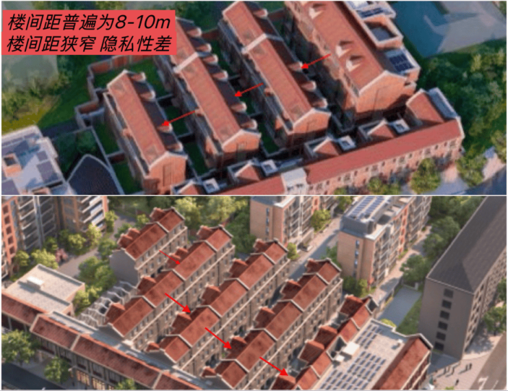 很多市中心低密的风貌别墅,哪怕容积率也在1.2左右,但它们的楼间距并不可观。几乎是在8-10m,宽一点的约12m,楼与楼之间非常紧凑,私密性难以得到保障。
