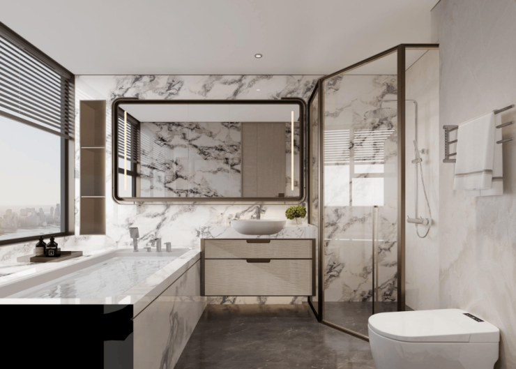 室内设置大金中央空调、新风系统和地暖,搭配斯麦格冰箱。厨房有博世四件套洗碗机、蒸烤一体机、油烟机和灶台。全屋岩板铺装,既耐用又显档次。卫生间干湿分开,配了高仪卫浴、智能马桶、暖风机,主卫还有浴缸和美妆冰箱。
