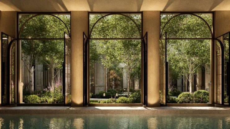 NO.8 花园泳池 波光潋滟处,拱形门窗外花影摇曳,一池春水将四季芳菲溶成流动的油画。
