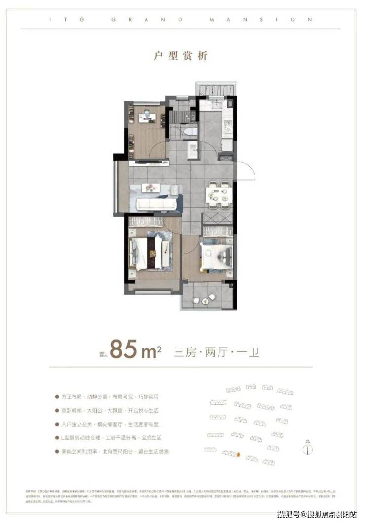 核心亮点 : 85㎡做三房一卫 ,空间利用率极高; 三开间朝南 + 全明通透 ,采光通风效果极佳; 双阳台 + 双飘窗 ,得房率约 80%-81%; 11-13 层低密小高层 + 高标精装 ,拎包入住,性价比远超同区域产品。
