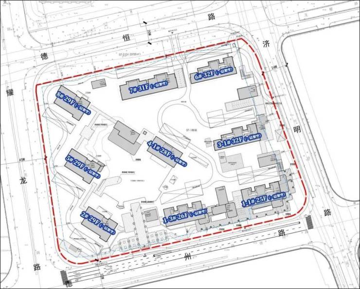 根据项目规划设计方案,07-01地块 拟建9幢超高层住宅,其中7幢百米高层住宅(28-32层)、1幢83米高住宅(25层)和1幢86米高住宅(26层) ,若干社区配套用房以及部分商业设施,共计规划约794户。