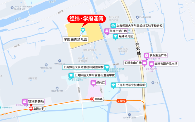 经纬学府涵青位于宝山区涵青路 398 弄,地处中外环间黄金区位,直线距中环线仅 1.5 公里,紧邻 211 高校上海大学宝山校区,浸润浓厚人文氛围,同时承接南大智慧城科创红利,兼具成熟烟火与发展潜力。