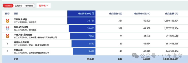 阳春伊始,项目就以成交套数、成交金额、成交单价、成交总价、成交面积 “五冠王”刷屏松江成交榜 ; 此后,一季度继续蝉联松江区 销售套数&金额TOP1 ,半年时点仍旧是板块套数、金额、成交单价三料冠军;到1-10月,更是在松江区和洞泾板块住宅成交面积、套数、金额上再度稳居前列!