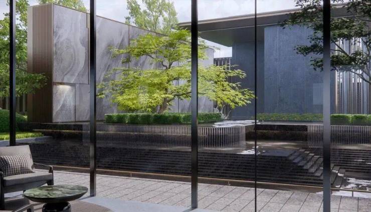 象屿交控·中环云悦府 该项目 外立面一二层基座部分为石材,三层及以上主体部分以玻璃+铝板幕墙为主。 整体效果现代精致,十分符合当下年轻人的审美观; 星级酒店式入户门,挑高约7米,宽约60米 ; 石材金属线条背景墙加暖色系夜灯搭配,中庭花园水岛层叠、景墙错落,槭树青红间季节流转的温情脉脉展现,精致的水景让居住者仿若初入剧宴,感受剧目的艺术呈现……
